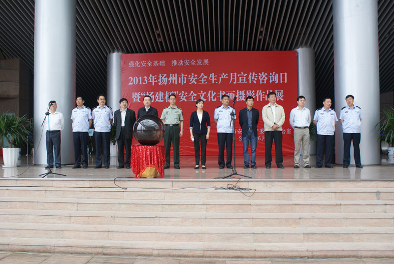 6月9日上午,2013年揚州市“安全生產(chǎn)月”宣傳咨詢?nèi)蒸?ldquo;揚建杯”安全文化書畫攝影作品展在市美術館北門廣場舉辦。副市長張寶娟出席了當天的活動,并和廣大市民一同參觀安全文化書畫攝影作品。市安監(jiān)局、交通局、公安局、建設局、氣象局、質(zhì)監(jiān)局等單位領導,以及部分駐揚單位職工代表,共計400余人參加了活動。