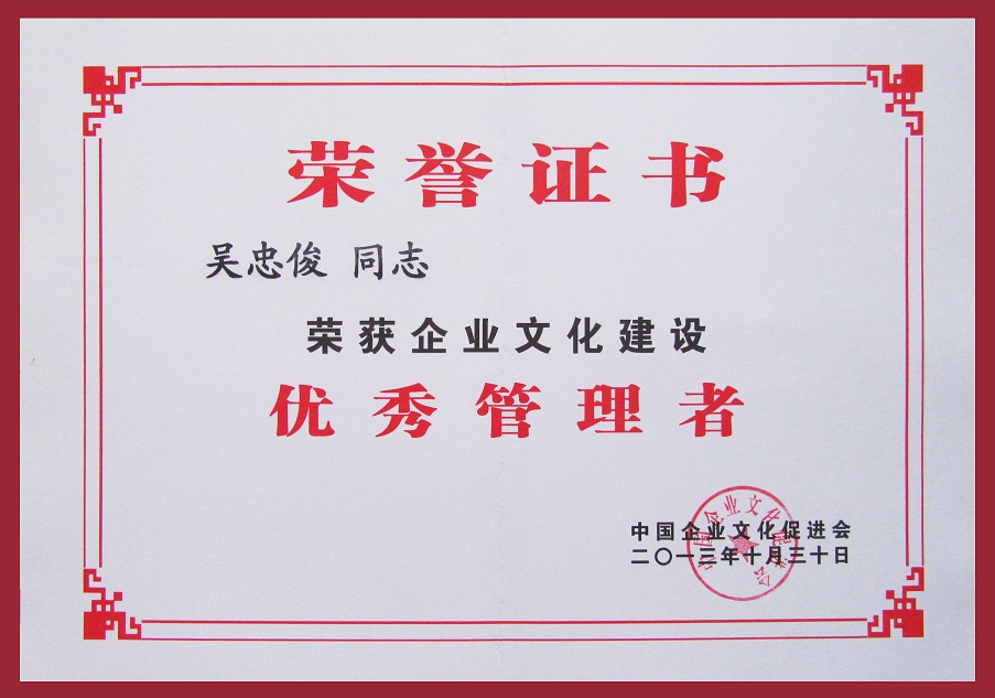 集團公司被授予“企業(yè)文化建設(shè)百佳單位”榮譽稱號;集團公司總經(jīng)理、黨委書記吳忠俊被第四屆七次理事會選為中國企業(yè)文化促進會副會長,并被評為“企業(yè)文化建設(shè)優(yōu)秀管理者”;集團公司企業(yè)文化策劃處處長俆世革被評為“企業(yè)文化建設(shè)先進工作者”。我司在企業(yè)文化建設(shè)方面的成績得到了充分肯定。