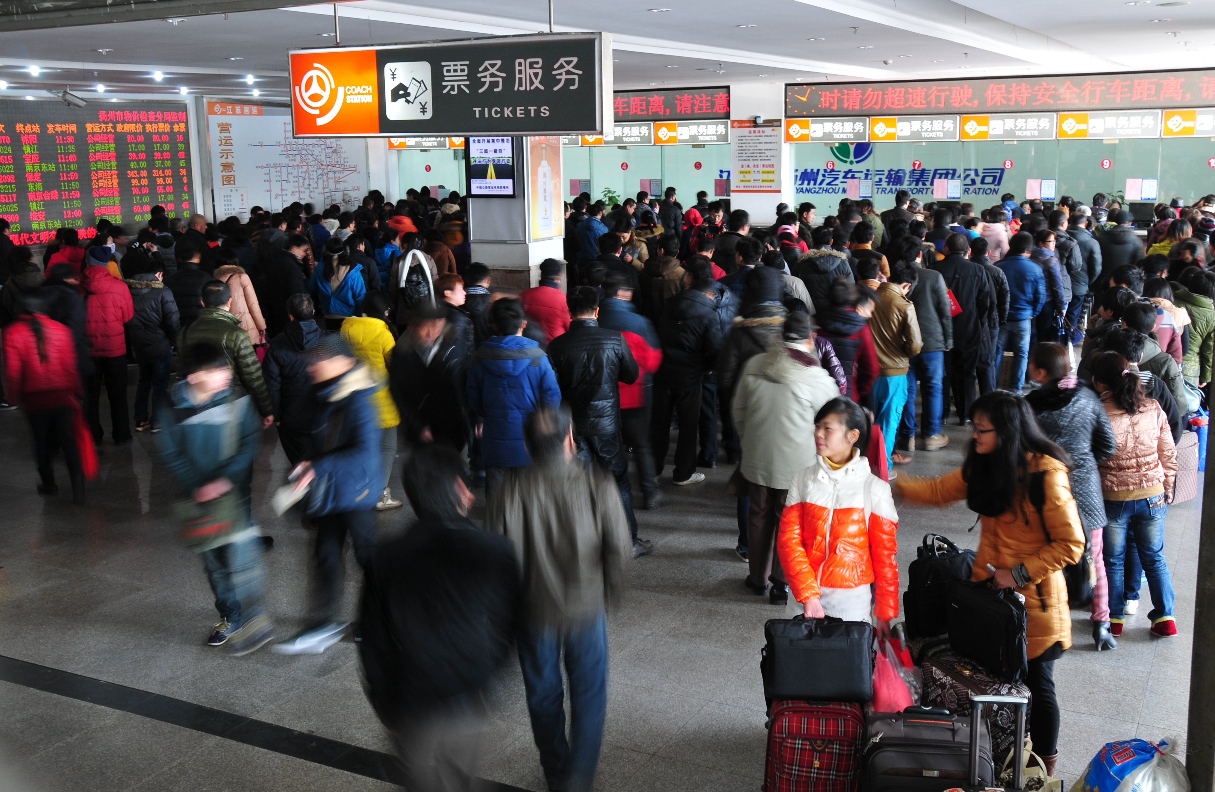 為應對旅客購票高峰壓力,揚州汽車站打開了10個售票窗口,汽車東站打開了7個售票窗口,另外還使用了自助售票機、配備了退票專窗、手機換取票專窗。為方便民工返鄉(xiāng),車站還主動聯(lián)系揚州晚報推出“民工返鄉(xiāng)直通車”,集中為市區(qū)周邊廠礦工地的民工兄弟團體預訂了近萬張汽車票。