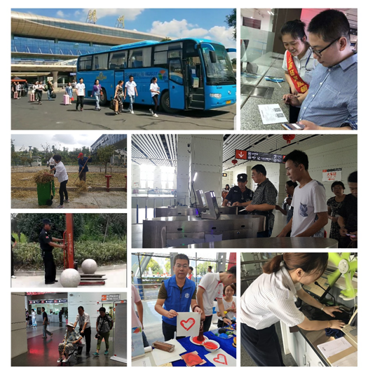 車(chē)站各班組分工協(xié)作打掃各自責(zé)任區(qū)域,清掃工作臺(tái)、參加"志愿服務(wù) 美好你我他"第三屆江蘇志愿服務(wù)展示交流活動(dòng)、清掃路邊綠化帶、噴灑藥水、除雜草滅蟲(chóng)害、整理通道入口、設(shè)備設(shè)施維護(hù)、消防安全檢查、身份實(shí)名驗(yàn)證、檢查危險(xiǎn)禁運(yùn)物品、檢查客車(chē)安全帶、為特殊旅客提供一站式服務(wù)、熱情引導(dǎo)購(gòu)票、候車(chē),征詢旅客意見(jiàn)、開(kāi)展問(wèn)卷調(diào)查,以整潔的站區(qū)環(huán)境、良好的精神風(fēng)貌和優(yōu)質(zhì)的候乘服務(wù)當(dāng)好東道主,文明迎盛會(huì)。