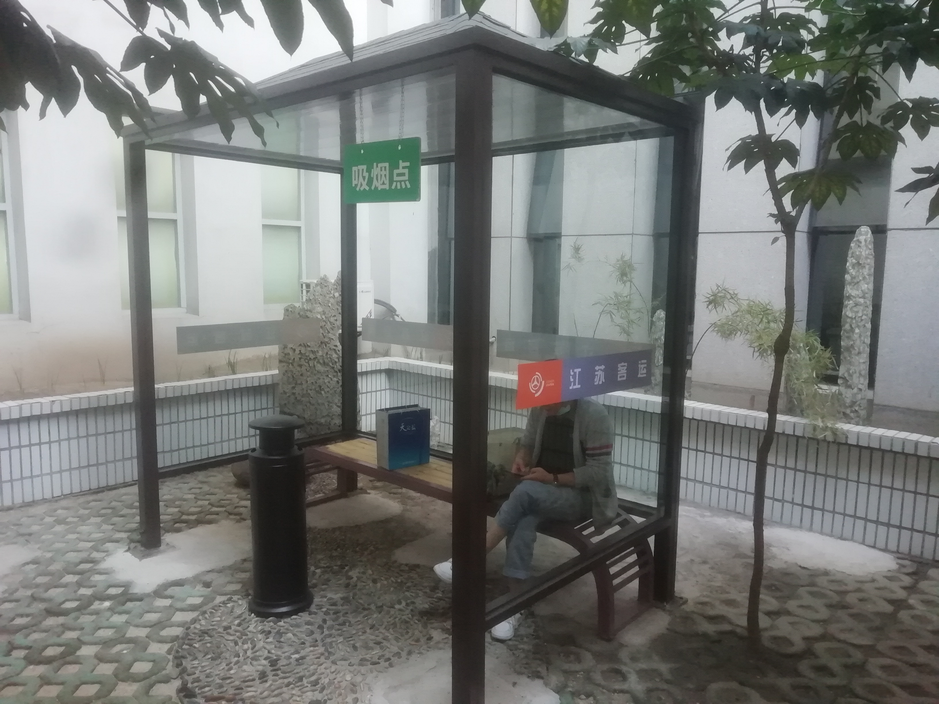 近日,汽車東站候車廳的東西兩側新添了一道風景線,在原本設置的露天吸煙室里各添置了一個吸煙亭,下雨的日子里,旅客也可以坐在室外抽煙了。