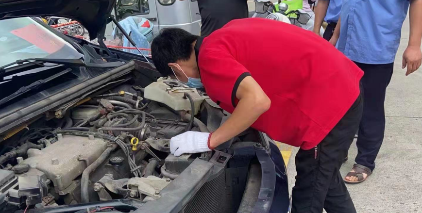 8月14日中午13.00,接到廠部電話通知,因疫情來揚(yáng)州支援的南京公務(wù)車輛因水溫過高而無法行駛停在⻄區(qū)大潤(rùn)發(fā)停車場(chǎng) ,得知情況后許學(xué)仁又主動(dòng)請(qǐng)纓前去搶修,他立即與車主取得了聯(lián)系并向車主詢問車輛故障現(xiàn)象,隨后和同伴馮琪準(zhǔn)備好工具便出發(fā)。趕到現(xiàn)場(chǎng)后,他們對(duì)⻋輛進(jìn)行了檢修,從而發(fā)現(xiàn)水箱爆裂導(dǎo)致水溫升高,隨即聯(lián)系配件供應(yīng)商,但因疫情和道路管控原因配件無法送達(dá),許學(xué)仁自己開車去尋找配件,一同前往的機(jī)修工馮琪便開始對(duì)水箱進(jìn)行拆解,兩邊同時(shí)進(jìn)行著,展開了一場(chǎng)與時(shí)間賽跑的“搶修戰(zhàn)役”,當(dāng)回到救援地點(diǎn),水箱以拆解好等待安裝,他倆便開始安裝,裝配完畢后開始試車與檢查水溫,水溫正常且風(fēng)扇完美轉(zhuǎn)動(dòng),車輛得已運(yùn)行,他兩露出了開心的笑容。