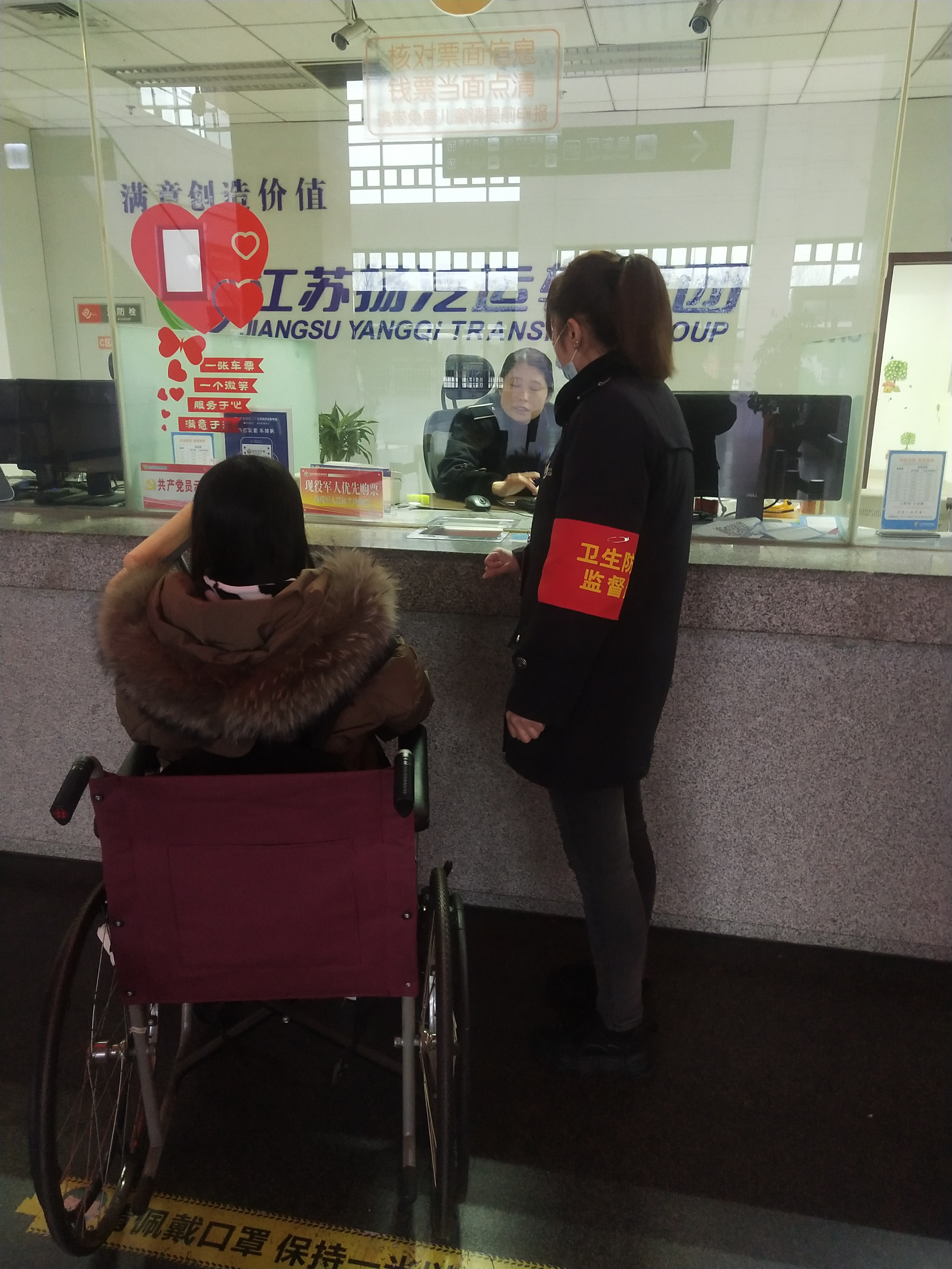 周俊云班長(zhǎng)讓她稍等會(huì),就幫她推來(lái)了車站里提供的輪椅,讓她坐在輪椅上面推她去售票窗口買票,還很熱心的一直送到重點(diǎn)旅客無(wú)障礙直升電梯里面,然后再送到二樓檢票口,直到幫助這位旅客上了車,臨走前還對(duì)旅客說(shuō)一句一路順風(fēng)。