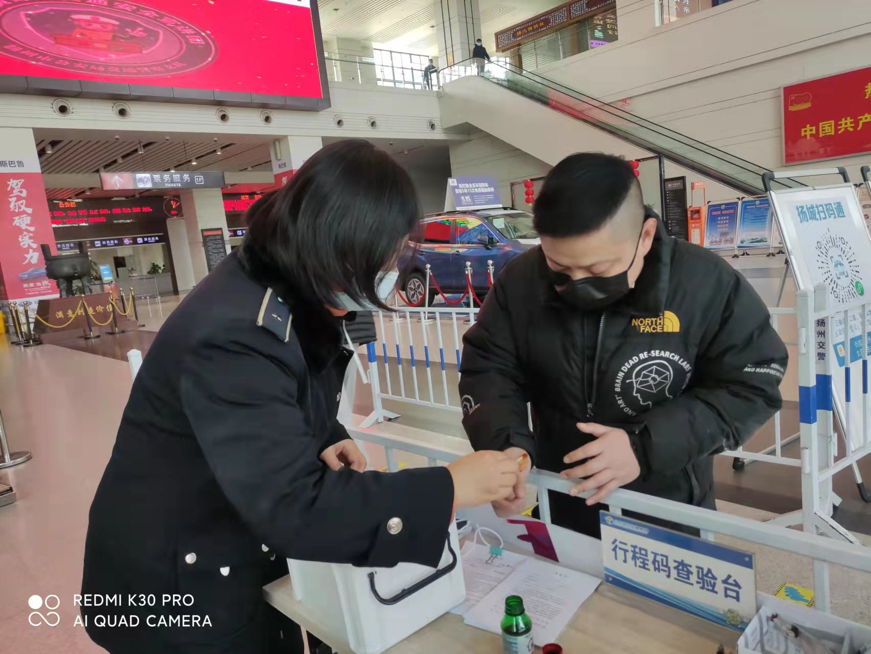 下午一點(diǎn)半,揚(yáng)州汽車站售票大廳門口,正在認(rèn)真查驗(yàn)行程碼的劉揚(yáng),看著對面遞身份證過來的一雙手,手上傷痕累累,手里握著一團(tuán)紙巾,紙巾上血跡斑斑,于是關(guān)切地詢問起來。經(jīng)詢問得知,原來旅客于先生是常州人,在揚(yáng)州出差三天了,估摸著今天的工作能夠忙完,想早點(diǎn)趕回常州,工作一結(jié)束,便從工作地點(diǎn)騎公共電動(dòng)車來揚(yáng)州汽車站乘車,誰知一個(gè)不小心,摔了一跤,羽絨服破了,手機(jī)摔壞了,兩只手也蹭破了好幾處,血不停地淌。