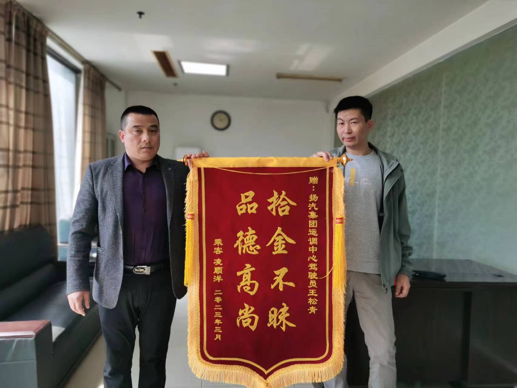 3月31日上午,市民凌先生來到江都汽車站,將一面印有“拾金不昧,品德高尚”的錦旗交到了分公司相關(guān)負(fù)責(zé)人的手上,以此來表達(dá)對駕駛員王松青師傅拾金不昧行為的感謝。